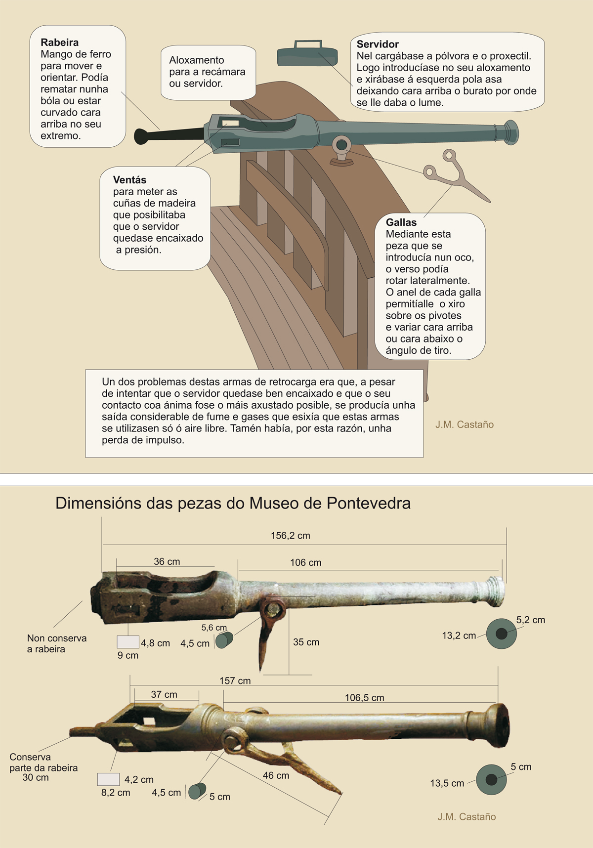 Os versos e falconetes (estes últimos dun calibre un pouco maior) eran armas de retrocarga que se usaban en terra, pero sobre todo a bordo dos barcos do s. XVI nas regalas dos costados de proa e popa. Ían unidos por unhas pezas cilíndricas (muñóns) a unhas gallas que se introducían nun oco na madeira, polo que podían xirar ó tempo que cambiar o ángulo de elevación.