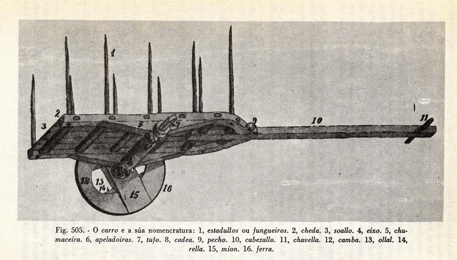 O carro de bois era máis pesado e de dimensións algo maiores co de vacas, malia que o seu funcionamento e os elementos eran os mesmos: dúas chedas en curva na parte dianteira, que forman o chedeiro, do que sae a cabezalla para suxeitala ó xugo por medio da chavella e do temoeiro, con cinco furas en cada unha para meter os fumeiros ou estadullos; o soallo, táboas entre as chedas, que forman o piso; as chumaceiras, unha a cada lado ó medio de cada cheda, sobre as que se aplican as apeladoiras ou diantoiras, entre as que xira o eixo.