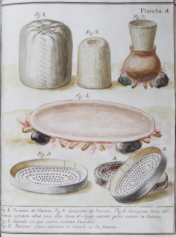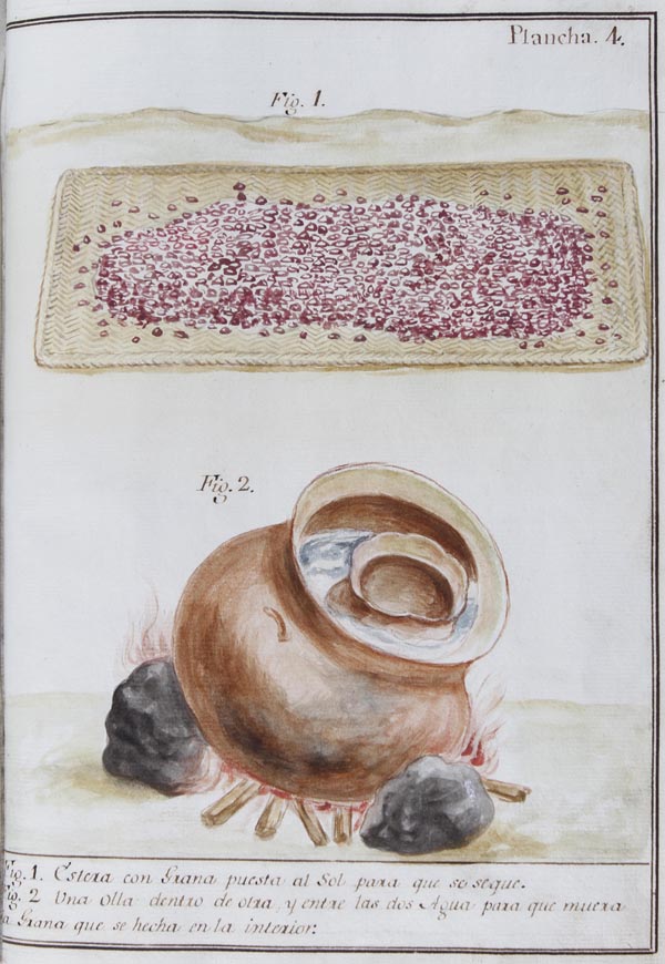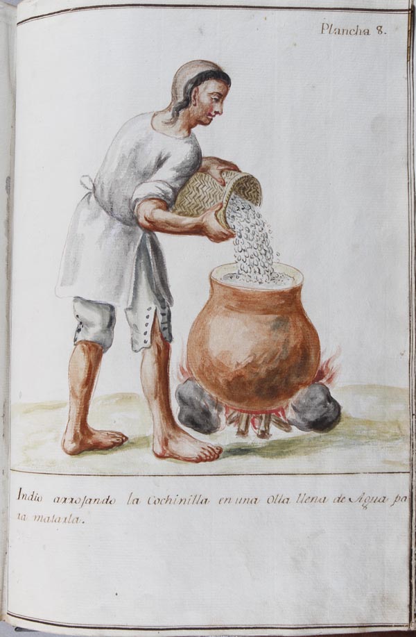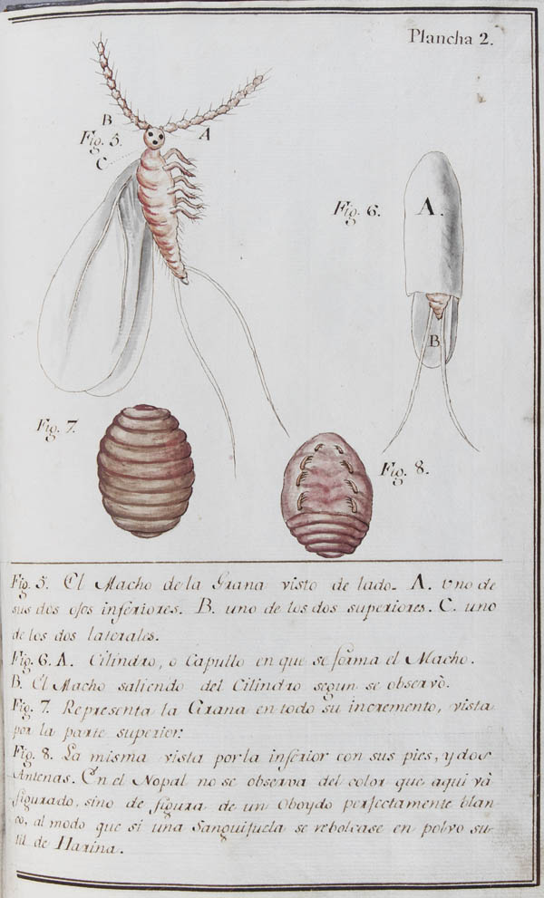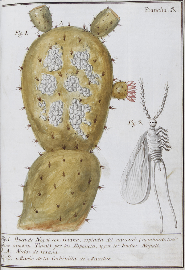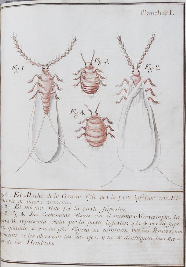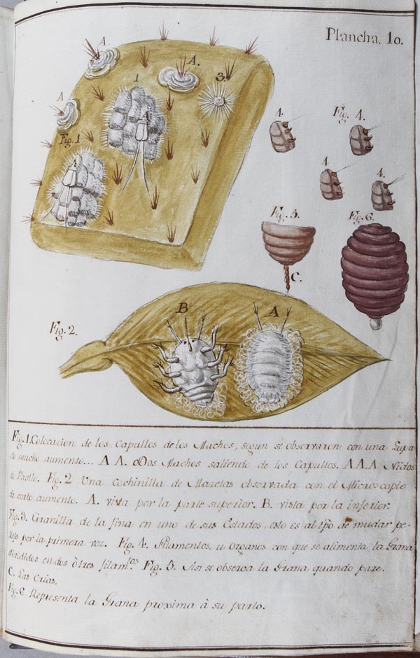 El tratado, fechado en 1777, está dedicado al rey Carlos III, cuyo retrato de cuerpo entero preside la primera página del libro. De caligrafía muy cuidada y encuadernado en cuero repujado y dorado, está ilustrado con diez láminas de acuarela originales y en colores, que representan tanto detalles del insecto como pormenores de las distintas fases de la elaboración del preciado tinte. En 1981 el Archivo General de la Nación de México hizo una edición facsimilar de dicho manuscrito, de tirada limitada, para conmemorar el traslado de su sede al edificio Lecumberri. Estamos pues ante un buen ejemplo de la observación y ciencias americanas en época de la Ilustración.