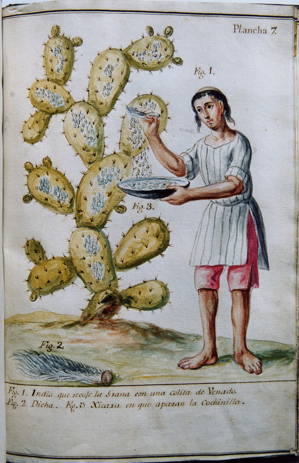 La grana o cochinilla es un insecto parásito de un cactus, el nopal o chumbera, del que se extrae un tinte natural de color rojo, como su propio nombre indica. Hasta la aparición y diversificación de los tintes químicos a finales del siglo XIX, el comercio de dicho tinte entre América y Europa fue muy intenso, siendo el estado mejicano de Oaxaca uno de los primeros productores de la época colonial, aunque se extendió luego a otras zonas como las islas Canarias.