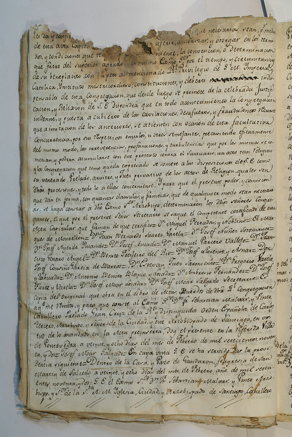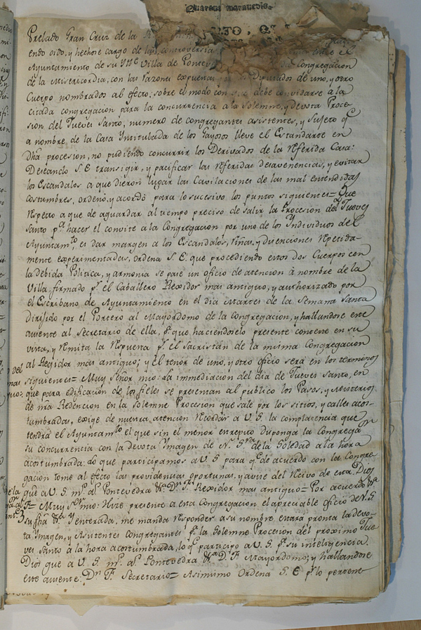 Entre los valiosos y numerosos fondos que conforman el Archivo documental del Museo de Pontevedra, destaca un importante documento para la historia de nuestra Semana Santa, la “concordia del pleito de las golillas”, correspondiente a la colección Sampedro, 27-13.