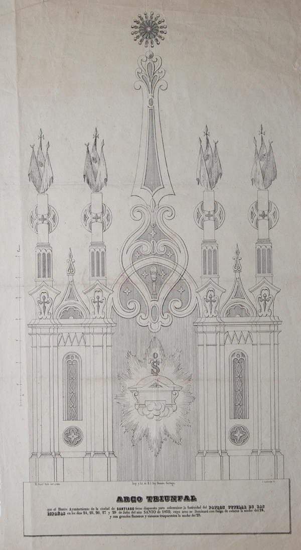 “Fiestas de Santiago”, Eco de la revista, Santiago de Compostela, 27-07-1852; ZEPEDANO, A. y NEIRA DE MOSQUERA, A., Relación de la llegada, permanencia y salida de SS. AA. RR. los Serenísimos Duques de Montpensier en Galicia, Santiago de Compostela, 1852; VILLASUSO FERNÁNDEZ, L.M., “Arcos de triunfo efímeros erigidos en la ciudad de A Coruña para los monarcas que la visitaron en la segunda mitad del siglo XIX”, Espacio, Tiempo y Forma, Serie VII, Hª del Arte, t. 20-21, 2007-2008, pp. 267-284.; TAÍN GUZMÁN, M., “Arquitecturas festivas catedralicias: los castillos y fachadas de los fuegos del apóstol Santiago”, SEMATA, nº 22, Universidad de Santiago de Compostela, 2010, pp. 495-518.
