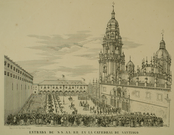 La crónica de la visita de los Duques de Montpensier a Galicia- su estancia en Santiago coincidió en el tiempo con la festividad del Apóstol- nos permite saber que la previsión inicial que en este grabado se recoge debió ser modificada como consecuencia de la inestabilidad atmosférica. La lluvia obligó a suspender los fuegos del 24, que fueron sustituidos por la luz eléctrica encargada de hacer brillar el enmaderado que sostiene la fachada de los fuegos artificiales. Lo mismo sucedería al día siguiente, en el que de nuevo la climatología adversa obligaría a posponer los fuegos artificiales, de antigua nombradía y merecido renombre. Un espectáculo de luz y color que finalmente tendría lugar en la tarde noche del 26 en la que los ilustres invitados contemplarían por fin la quema de la citada fachada.
