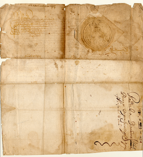 Ademais do selo de placa e sinatura da raíña, leva a firma do seu secretario, Alfonso de Ávila, quen a fixo escribir polo seu mandato.