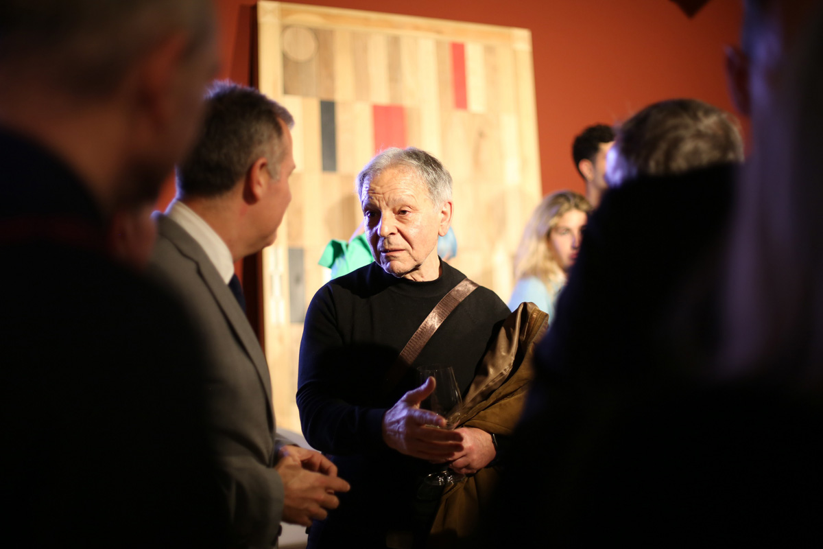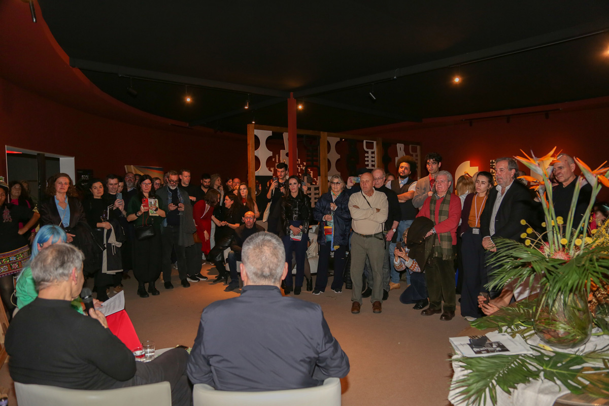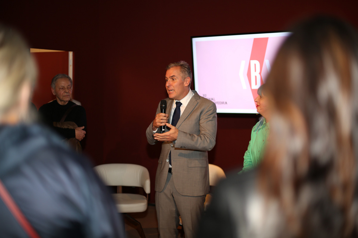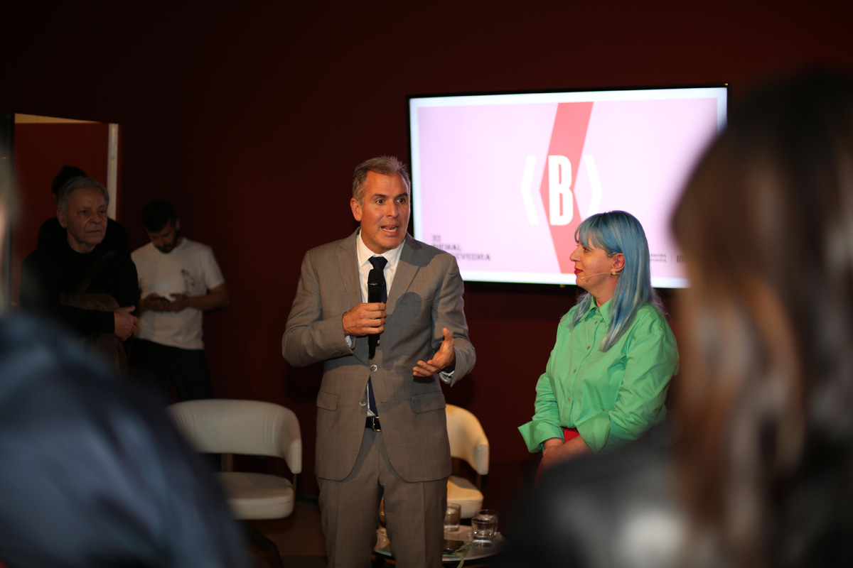A parte central do acto foi unha conversa da artista escénica pontevedresa Marta Pazos co comisario xeral da Bienal, Antón Castro e co responsable do programa de artes vivas, Iñaki Martínez Antelo. Na súa presentación, Pazos puxo en valor que a bienal más antiga de España volva “cunha proposta ambiciosa e necesaria: nun mundo fracturado por conflitos, invítanos a un exercicio colectivo de reflexión, empatía e imaxinación a través da arte”. Pola súa banda, Antón Castro explicou como ese obxectivo marcado desde o lema desta edición, “Volver a ser humanos. Ante a dor dos demais”, se fai explícito nunha selección de artistas e obras que abordan a cuestión dos conflitos bélicos e a necesidade dunha resposta de esperanza. Moitos dos e das artistas que estarán na Bienal teñen obra exposta nesta edición de Arco, e varios asistiron á presentación, como Manuel Casimiro, Almudena Fernández Fariña, Carmen Hermo, Norberto Olmedo, Dagoberto Rodríguez ou Iodia Cuesta. Tamén asistiu Carlos Rosón, cuxa fundación RAC será unha das sedes da Bienal de Arte de Pontevedra.